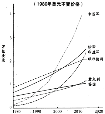 材料一 但1433年中国的远征(郑和下西洋)是这条航线的最后一次,3年以后一项皇帝诏书禁止建造海船……诚然这项决定有一种似乎有理的原因。帝国北部边疆再次遭受蒙古人的威胁,把军事资源集中到这个比较脆弱的地区或许是谨慎的。在这种情况下,一支强大的海军是一种耗费巨大的奢侈……中国倒退的关键因素是信孔子学说的官员们的保守性。这一保守性在明朝时期因对蒙古人早先强加给他们的变化不满而加强了,所有重要官吏都关心维护和恢复过去,而不是基于海外扩张和贸易的更光辉的未来。根据孔子学说的行为准则,战争是一种可悲的活动,而军队只有在担心蛮族入侵或内乱时才有必要。达官贵人对军队(和海军)的厌恶伴随着对商人的疑虑。私人资本的积累、贱买贵卖的做法、暴发户商人的铺张阔气,都冒犯了这些权贵士大夫……同样禁止海外贸易和海洋渔业,更消除了刺激经济持续发展的另一潜在因素。 ——(美)保罗·肯尼迪《大国的兴衰》 (1)根据材料一概括明朝实行海禁政策的原因。根据材料一并结合所学知识,分析这一政策的消极影响。(7分)材料二 1914年时的欧洲霸权不仅在广度上,而且在深度上也是前所未有的:这一点能从欧洲所实行的经济控制中察觉出来。欧洲已变成世界的银行家,为建造横穿欧洲大陆的铁路、开凿沟通海洋的运河、开发矿山、建立种植园提供所需的资金,欧洲不仅成了世界的银行,而且已成为世界的工业工场。1870年,欧洲的工业产量占世界工业总产量的64.7%。……欧洲资本和技术大量输出的结果是全球经济空前统一:到1914年时,除了在全球陆地上架设了庞大的电报和电话线路网外,已有总吨位为5000万吨的3万多艘船只货物往返于世界各地。几条运河的开凿便利了世界贸易,几条横贯大陆的铁路建成打开了诸大陆经济开发的大门……诸大陆这一经济上的一体化导致了全球生产率的惊人发展。1860年至1913年间,世界工业产量至少增加了6倍,1851年至1913年间,世界贸易额增加了12倍。正如所预料的那样,欧洲在这一经济腾飞中得益最多……据估计:1800年,欧洲宗主国的人均收入与殖民地半殖民地的地区人均收入的差距大约是3:1,而到1914年时这一差距则增加到约7:1。 ——斯塔夫里阿诺斯《全球通史》 (2)根据材料二,概括欧洲霸权在广度、深度上的表现。根据材料二并结合所学知识,概括经济一体化实现的手段。(8分)(1980年美元不变价格) 材料三 中国、印度和某些西欧国家1980—1999年国内生产总值变化