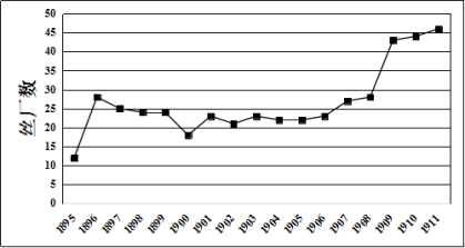 (2018·百校联盟3月联考题·28)图4是1895年—1911年中国机器缫丝厂数量的变化情况。此时期推动机器缫丝厂数量变化趋势形成的主要原因是( ) |