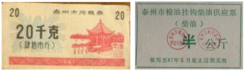 (2015·江苏泰州·41)活动课上,小向同学们展示了两张泰州市1987年发行的购粮券和柴油供应票(见下图)并配上了说明文字,其中表述错误的是( )