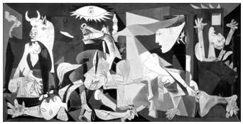 (2017·四川乐山·14)如图所示油画以抽象派象征主义的形式,描绘出痛苦的人物和动物形象,揭露法西斯的野蛮,抗议战争的残酷。该作品是( ) |
