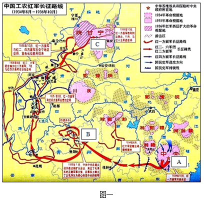 (2018·湖南衡阳·31)(5分)读图一,回答下列问题。 (1)请写出图中英文字母所代表的地名。中央红军长征出发地A:___________;长征 |