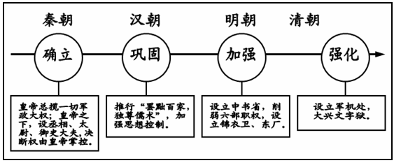 (2021·江苏淮安·13)下图是中国古代君主专制的确立与强化示意图。其中相关措施不符合史实的是( )
