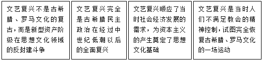 (2017·山东泰安【非】 ·10)某历史研究性学习小组以“文艺复兴不是复古而是创新”为话题进行讨论。下面是四位同学准备的发言卡片,你认为正确的是( ) |
