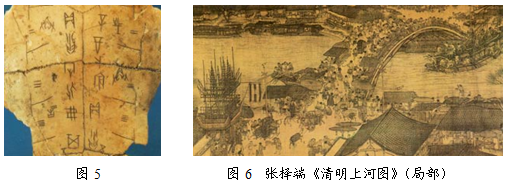 材料一 材料三 中医是我国传统文化的瑰宝,明代医药学家李时珍全面总结了我国古代药物学的成就,同时根据自己一生行医用药中对药性的实际体验,写成了一部药物学巨著,这部巨著被译为日、英、德、法、拉丁、俄等文字,在世界医学领域有很高的学术地位。 (1)图5所示的文字是商朝时期刻在龟甲和兽骨上的文字,它被称作什么文字?图6是研究哪一朝代商业活动和城市生活风貌的重要资料(4分) (2)材料二中的这位数学家是谁?(2分) (3)请说出材料三中李时珍编写的这部药物学巨著的名称。(2分) (4)综合以上材料和所学知识,谈你对中国古代传统文化的认识。(2分) |