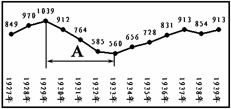 (2019·江苏盐城·19)下图为1927~1939年美国国民生产总值变化图(单位:亿美元)其中影响A段国民生产总值变化的事件是( ) |
