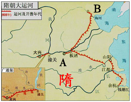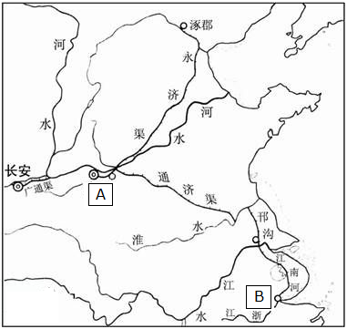 (2)大运河以A_______为中心 ,(2分)北达涿郡,即今天的 ________,(2 分)南至B________ 。(1分) |