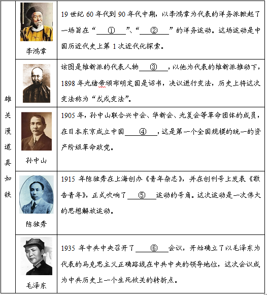(2021·黑龙江牡丹江·26)(6分)近代以来中华民族遭受的苦难之重,付出的牺牲之大,在世界历史上都是罕见的。但是中国人民从未屈服,终于掌握了自己的命运。回顾昨天可以说是“雄关漫道真如铁”,这个过程中,重要的历史人物是推动历史发展的重要因素。根据图片并结合所学知识完成下列填空。 |