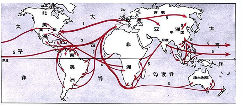 A.改变亚欧大陆政治格局 B.形成了 “希腊化世界 ” C.促进本民族文化的发展 D.改变了美洲人口结构 (3)下图为世界人口大迁徙流动方向示意图,导致这一历史变化的因素有(三选,6分)